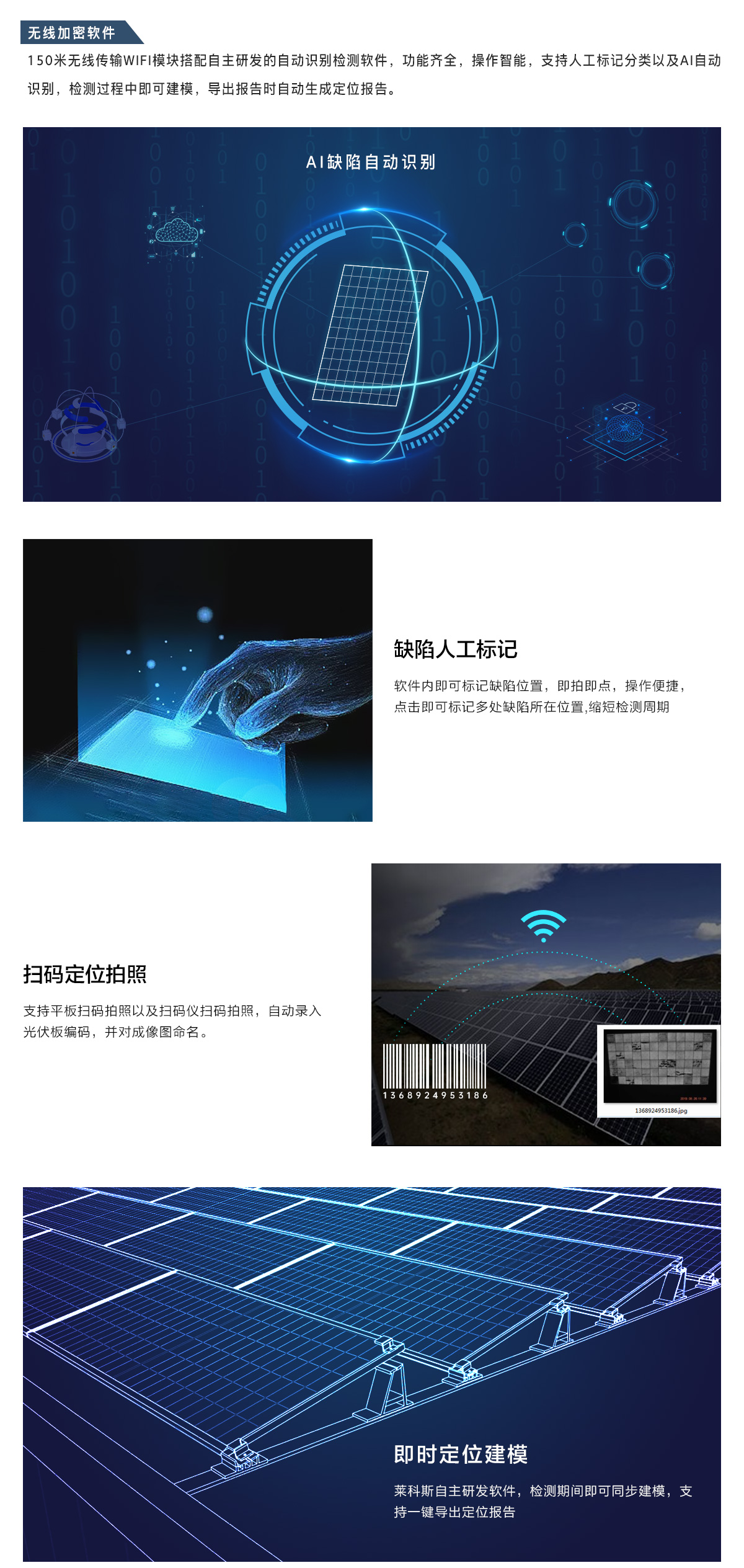 針對漁光互補,農(nóng)業(yè)大棚,山地電站,常規(guī)的拍照性EL檢測儀已經(jīng)遠遠無法達到市場檢測需求,操作難,作業(yè)危險成為了主要障礙。經(jīng)過LAILX多年努力,LAILX突破了光伏EL缺陷檢測掃描性檢測難點。萊科斯最新研發(fā)生產(chǎn)的《EL掃描儀》可實現(xiàn)電池片/電池板/方陣組件的局部與大面積掃描性檢測,檢測畫面視頻實時同步傳輸,多種操作方式可快速完成大面積的電池板EL內(nèi)部缺陷檢測。